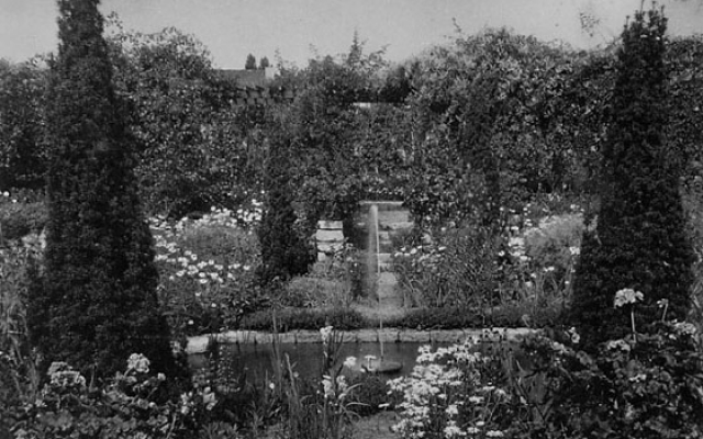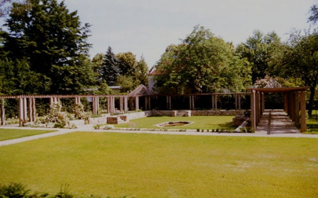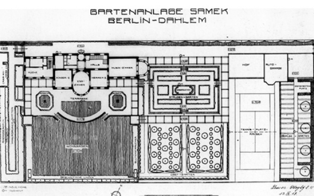 Die Geschichte dieses Grundstückes ist etwas kurios. 1919 hatten der Gartenarchitekt Ludwig Lesser und der Architekt Hermann Muthesius für den Grundstücksbesitzer Alfred Samek in Berlin-Dahlem ein großes Landhaus mit Garten als Gesamtanlage geplant. 1920 wurde zunächst der große Garten mit den Trockenmauern, dem blühenden Senkgarten, dem bewachsenen Laubengang und dem Obstgarten angelegt. Bevor es zum Bau des Landhauses kam, verkaufte Samek das Grundstück jedoch. Der neue Besitzer übernahm die Planungen nicht, sondern ließ von dem Architekten Hermann Karpenstein ein neues Gebäude planen. Der bereits fertiggestellte Garten wurde jedoch belassen und ergänzt.
