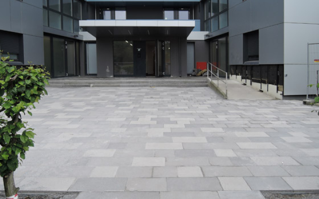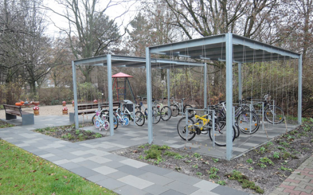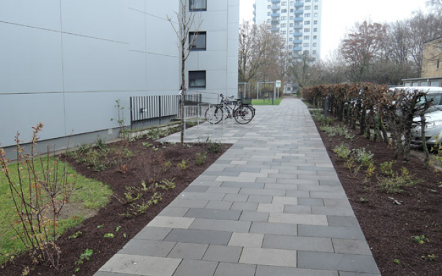 Im Zuge einer energetischen Gebäudesanierung wurde auf dem gesamten Grundstück eine Wohnumfeldverbesserung durchgeführt. Jetzt werten in drei verschiedenen Grautönen bunt gemischt verlegte Betonsteine von der Fa. Godelmann den Zugang zum Hochhaus, den Fahrradplatz und den Spielplatz auf. Ein überdachter Fahrradabstellplatz wird mit der Zeit von Kletterpflanzen bewachsen.