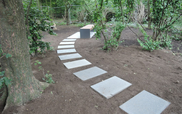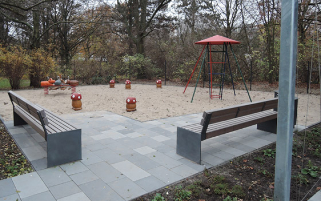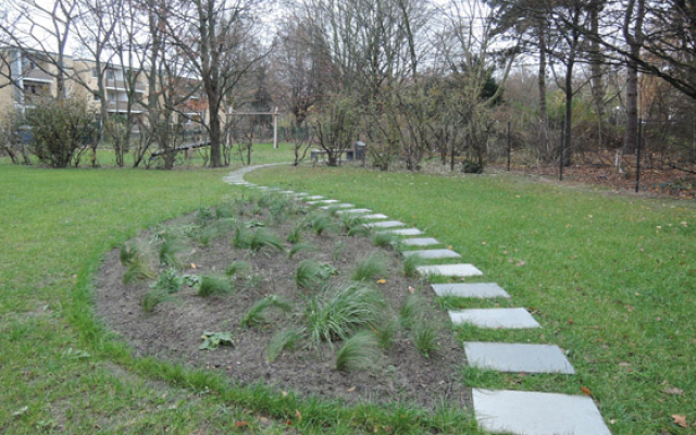 Ein geschwungener Plattenweg führt vom Fahrradplatz und dem vorderen Spielplatz an einem ovalen Beet vorbei zur Waldlichtung. Mehrere Sitzplätze mit Bänken der Fa. Runge runden die Gestaltung ab und erhöhen den Aufenthaltswert für Mieterinnen und Mieter.