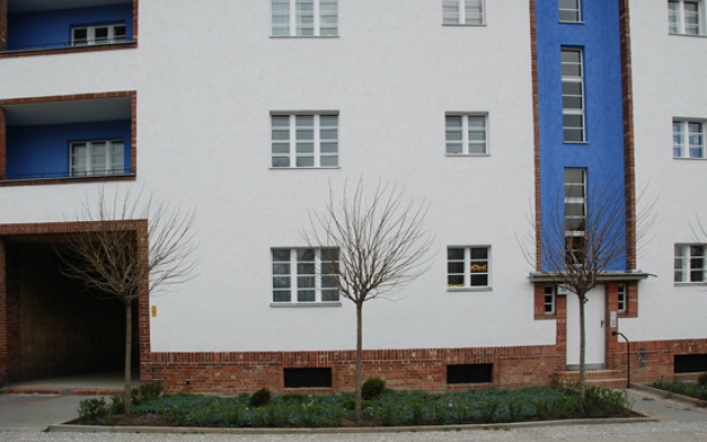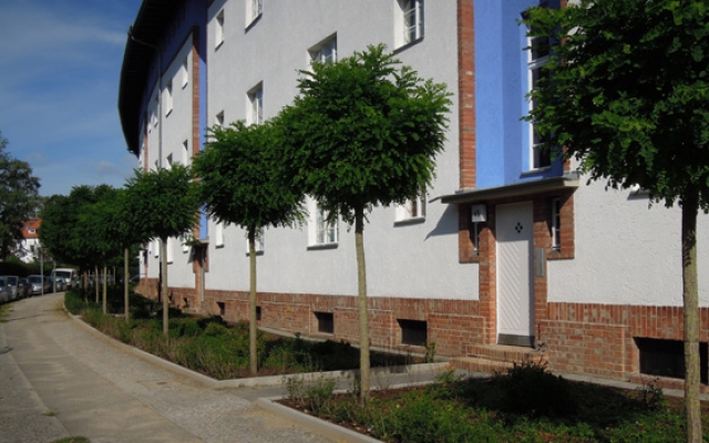 Der nur vier Meter breite Vorgartenstreifen rund um das Hufeisengebäude am Lowise-Reuter-Ring wurde 1926 mit Ligusterhecken eingefasst und mit 98 kugelig beschnittenen Robinien-Hochstämmen bepflanzt. Diese wurden in den 1970er Jahren jedoch durch eine geringere Anzahl Säulen-Hainbuchen ersetzt, die 2009 nicht mehr vollständig erhalten waren. Die hohen Bäume drückten Kantensteine hoch, verschatteten Wohnungen und verstellten die Fassade.