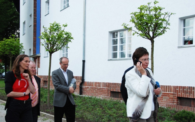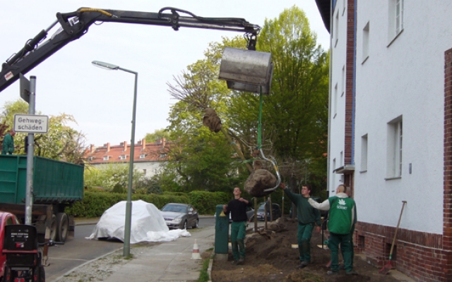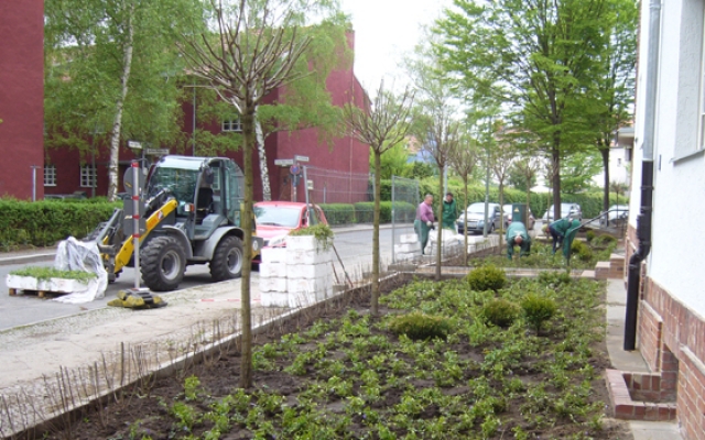 Obwohl alle Beteiligten: das Bundesbauministerium, der Senat, das Landesdenkmalamt, die Bauherrin und die Gutachterin die Fällung der Säulen-Hainbuchen und einheitliche Neupflanzung befürworteten, war es ein Kraftakt, das Bezirksamt von der Maßnahme zu überzeugen. In einem ersten Schritt wurden im Frühjahr 2010 zunächst die freien Beete neu bepflanzt und 2011 dann in einem zweiten Bauabschnitt die weiteren Beete vervollständigt. Jetzt erfreuen sich Bewohner und Touristen wieder an dem homogenen Bild.