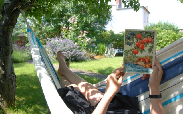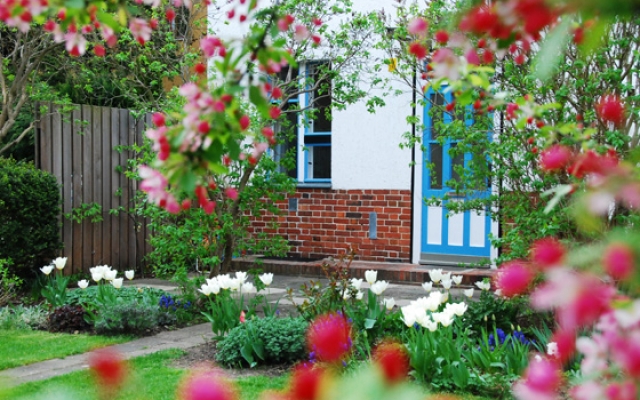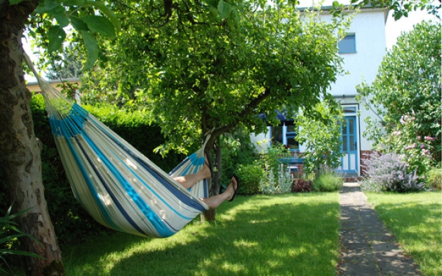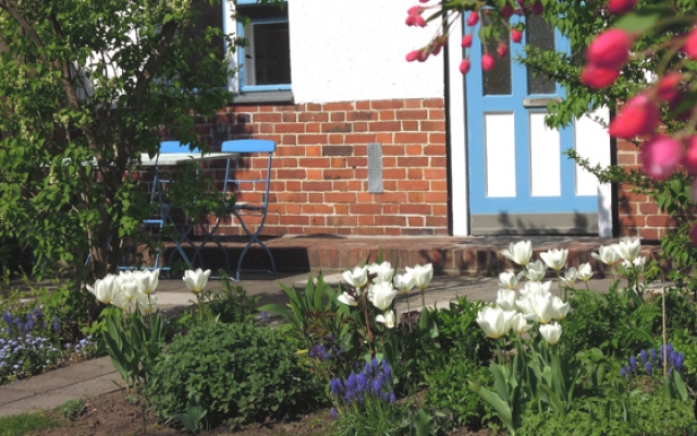 Der Garten wurde nach historischen Vorlagen originalgetreu wiederhergestellt. Mehrere Zier-Äpfel, Obstbäume, Beerensträucher, Fliederbüsche und die umlaufende Wildrosenhecke charakterisieren einen typischen Garten aus den 1930er Jahren. Dem Gebäude vorgelagert findet sich eine kleine Terrasse, auf der es sich die Besucher gemütlich machen und die bunt blühende Staudenrabatte betrachten können.