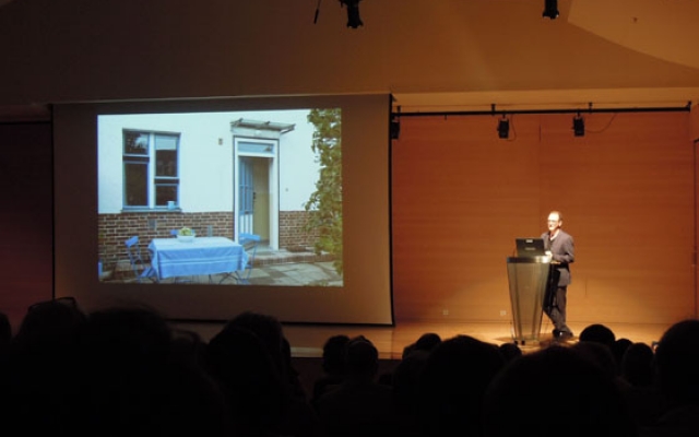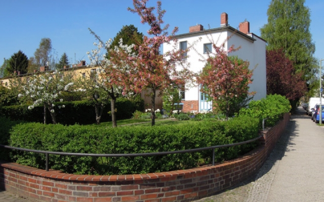 Im südlichen, moderneren Teil der Hufeisensiedlung aus der U-Bahn steigend, fällt der Blick schnell auf das markant aus der Zeile hervorschauende „Taute Heim“ mit seiner klaren Formensprache. Der klassisch moderne Bau liegt leicht erhöht inmitten eines etwa 200 qm großen Gartens.